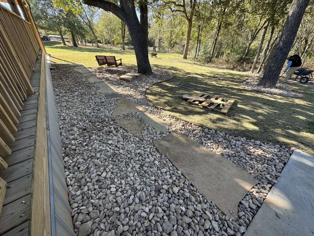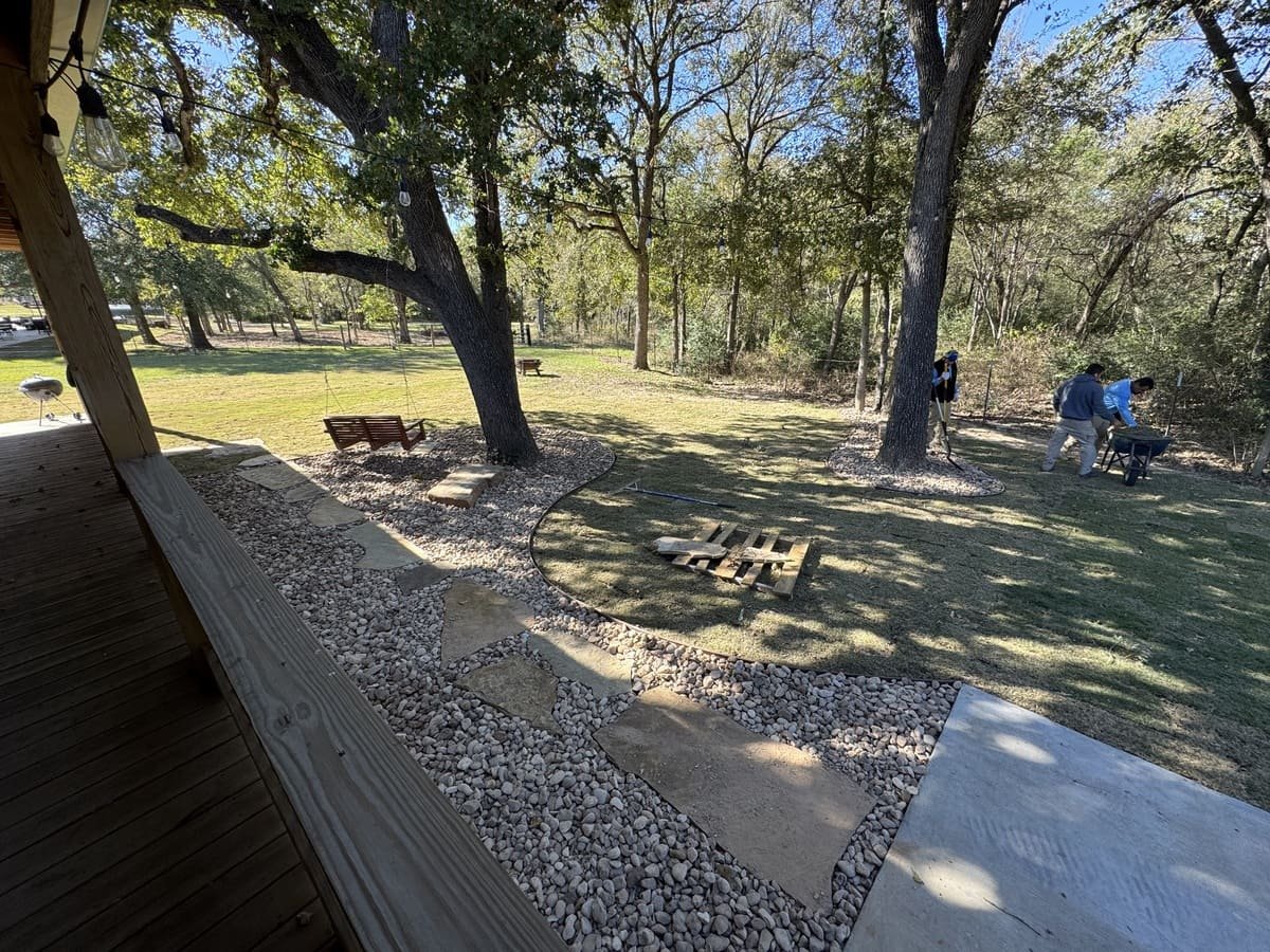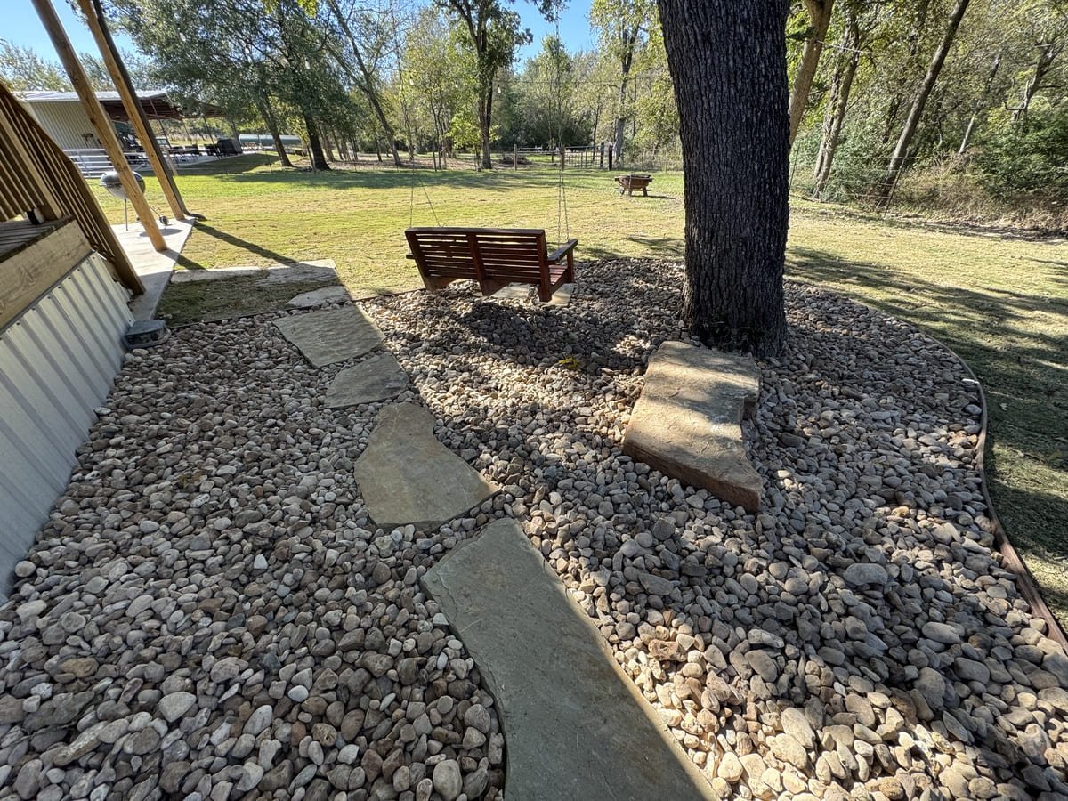 In shaded yards, grass often struggles to survive, leaving bare soil and constant erosion around trees. That was the case in this Bremond property, where repeated attempts to grow turf were unsuccessful. The area lacked a reliable surface and made the space under the trees difficult to enjoy or maintain.
